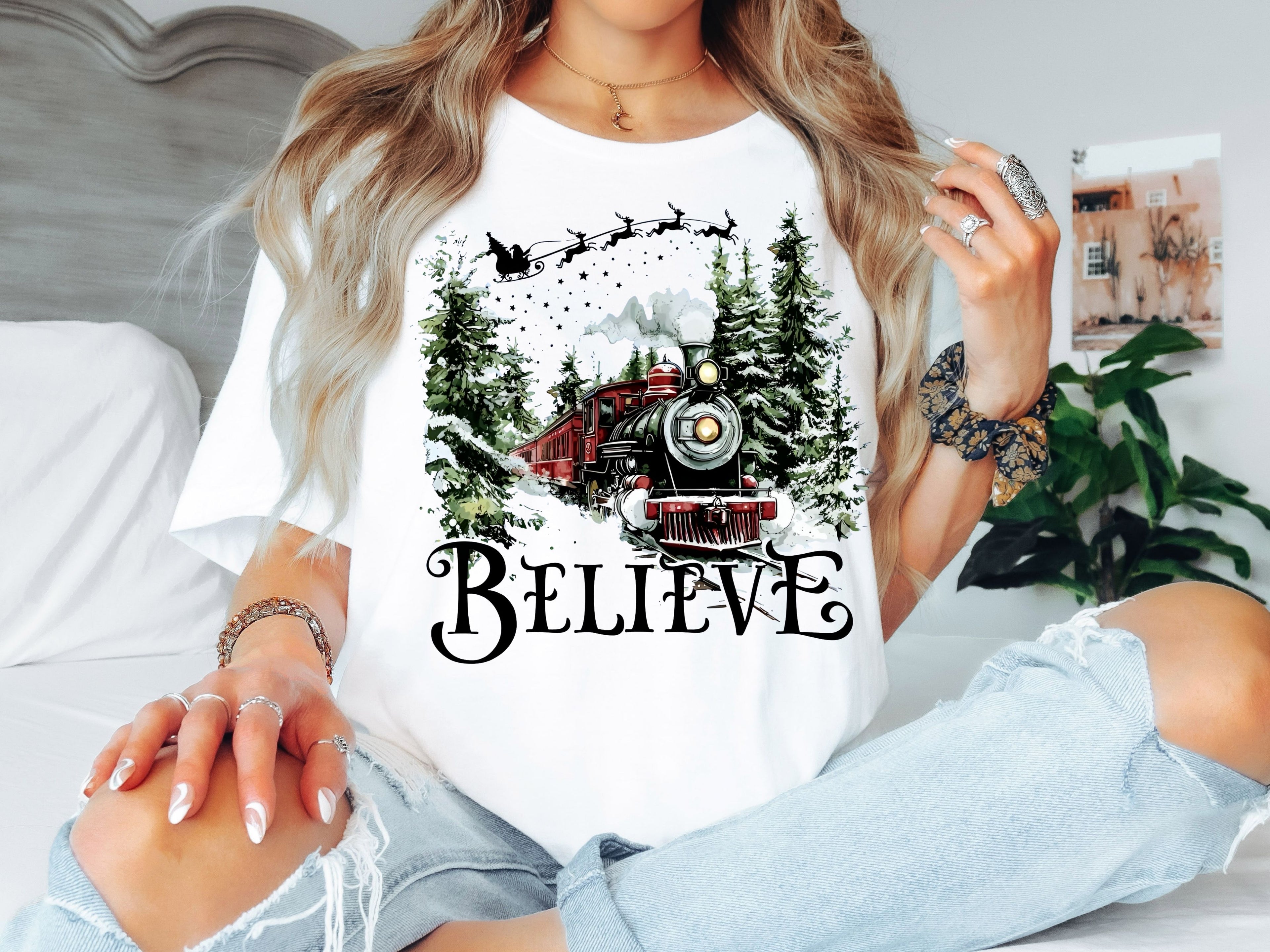 Believe Christmas Train T-Shirt | Vintage Holiday Polar Express Tee | Classic Christmas Shirt for Adults & Kids-7C017